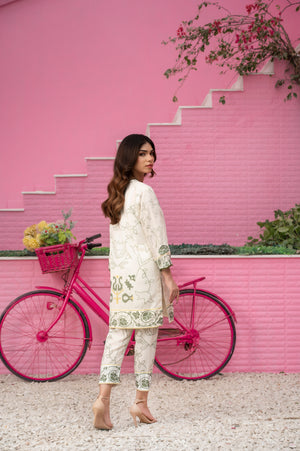 An elegant co-ord set in soft ivory, elevated with delicate 3D floral appliqués 🌸 and subtle embroidery for a touch of luxury.