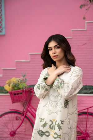 Elegant white kurta and trousers set with olive green motifs in digital print