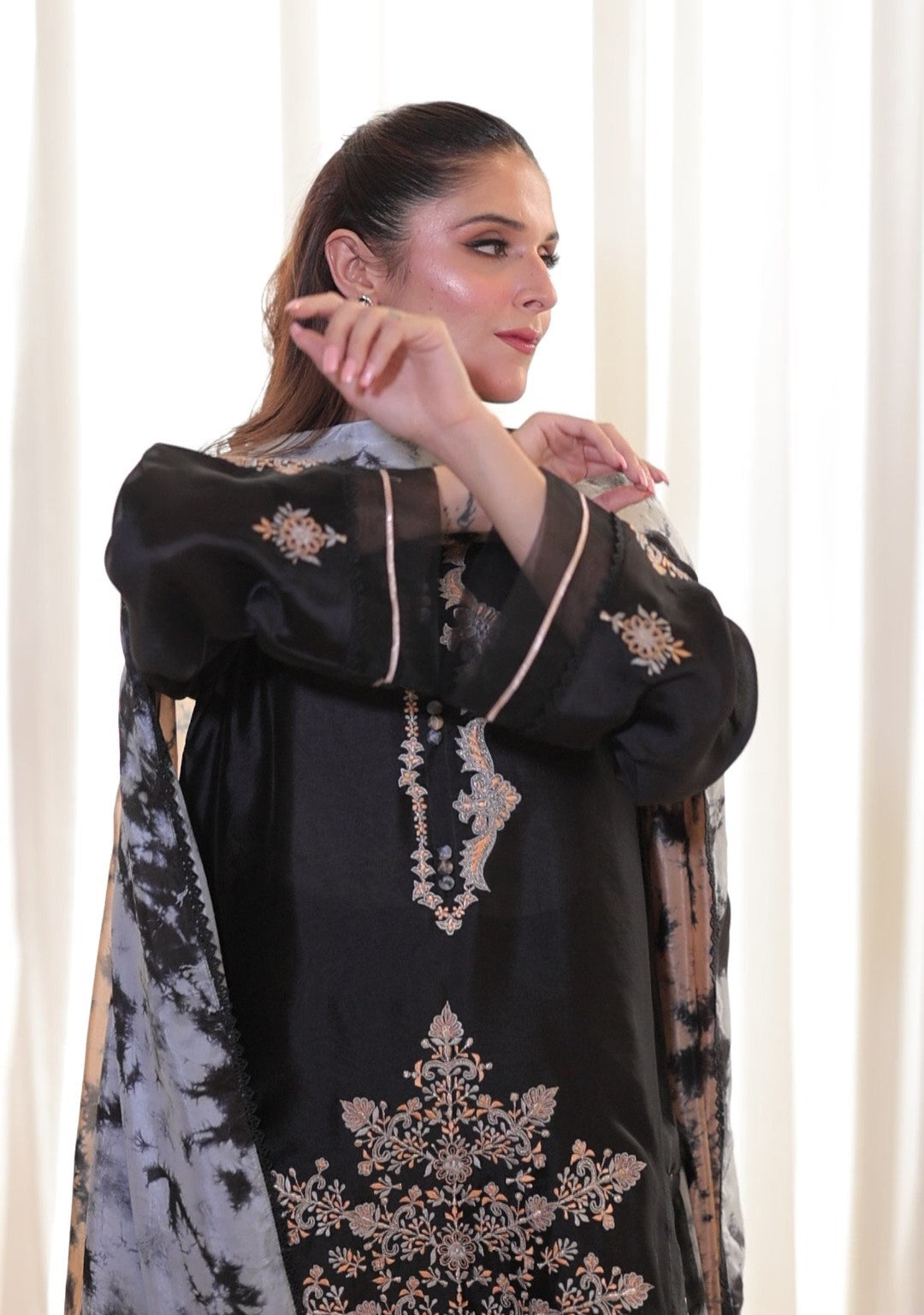 Elegant black Sheesha silk shirt and pant set with intricate embroidery and optional tie & dye silk dupatta