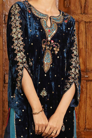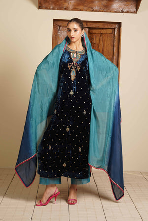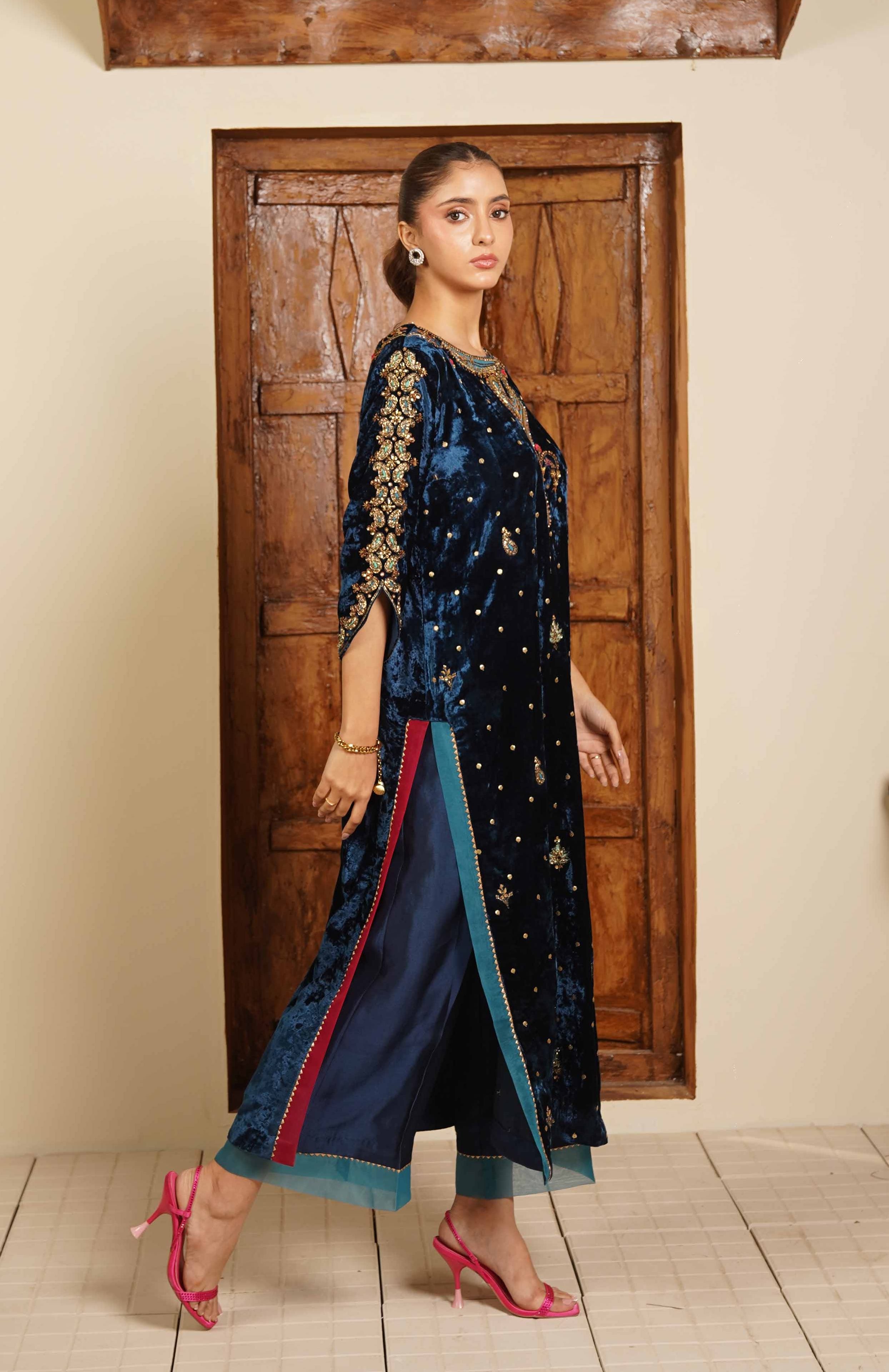 Step into festive elegance with Cosmic Glitter, a statement outfit crafted for those who love rich textures and striking handwork. The shirt comes in luxurious velvet, adorned with intricate hand embroidery on the front and fully hand-embroidered sleeves. Two-tone organza detailing on the shirt chalks adds depth and a modern finish.