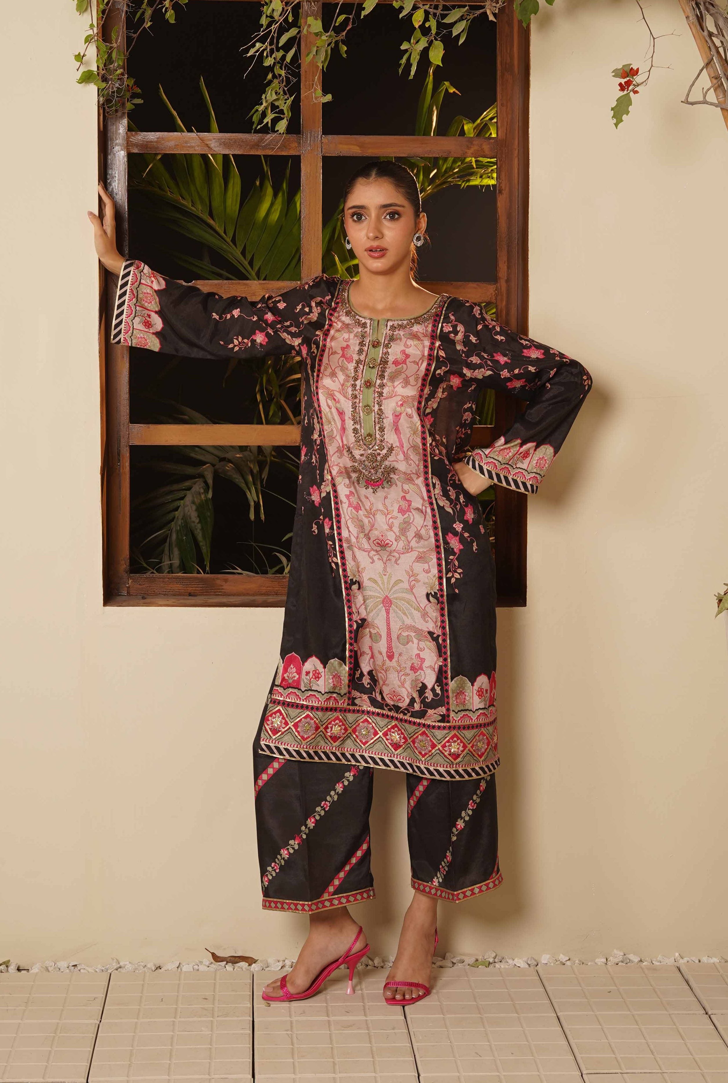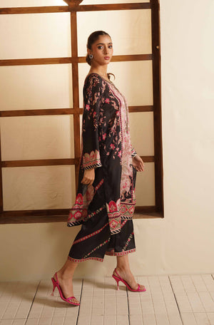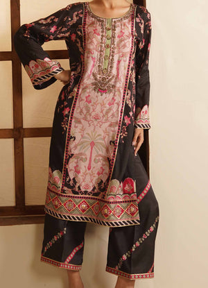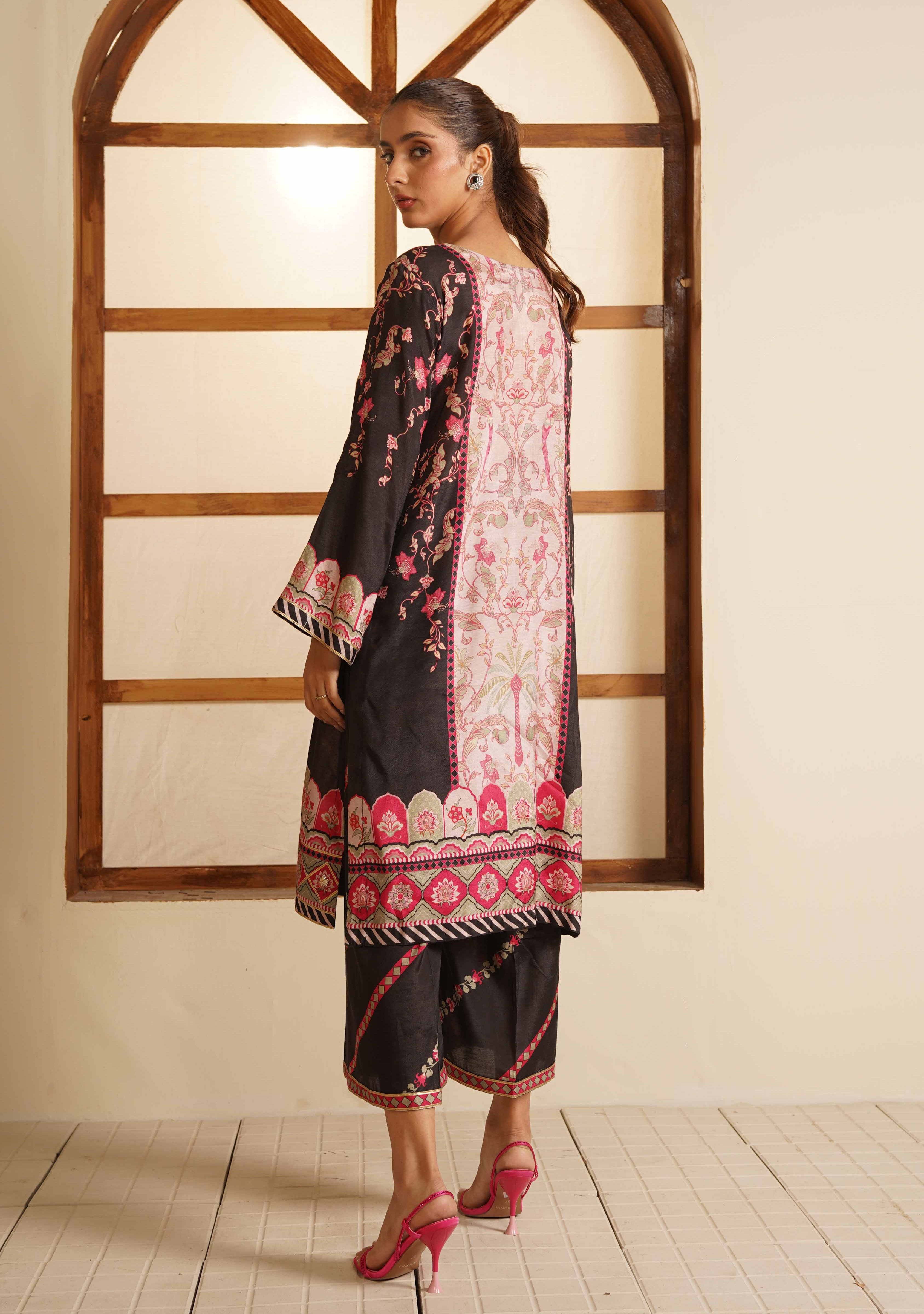 Elevate your elegance with our Rose Quartz outfit — a beautifully crafted 2-piece set designed in premium silk. The shirt features digital printing and exquisite full hand-worked neckline, enhanced with delicate goti detailing for a refined, festive finish.
