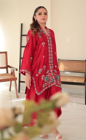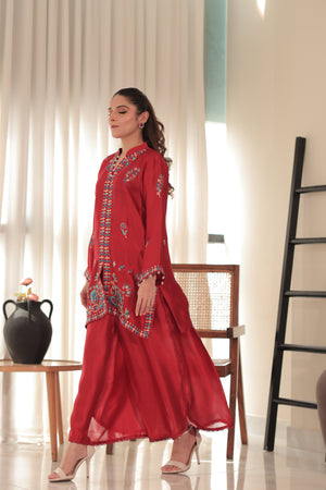 Model wearing Chillie 2-piece Sheesha silk outfit in bold red with turquoise and maroon embroidery, paired with lace-detailed pants