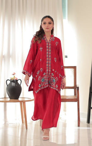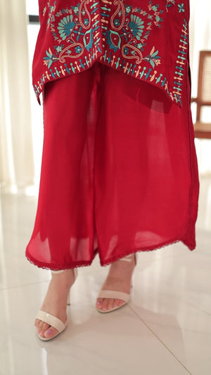 Red embroidered Sheesha silk shirt with matching wide-leg pants and optional organza or silk dupatta with tassels