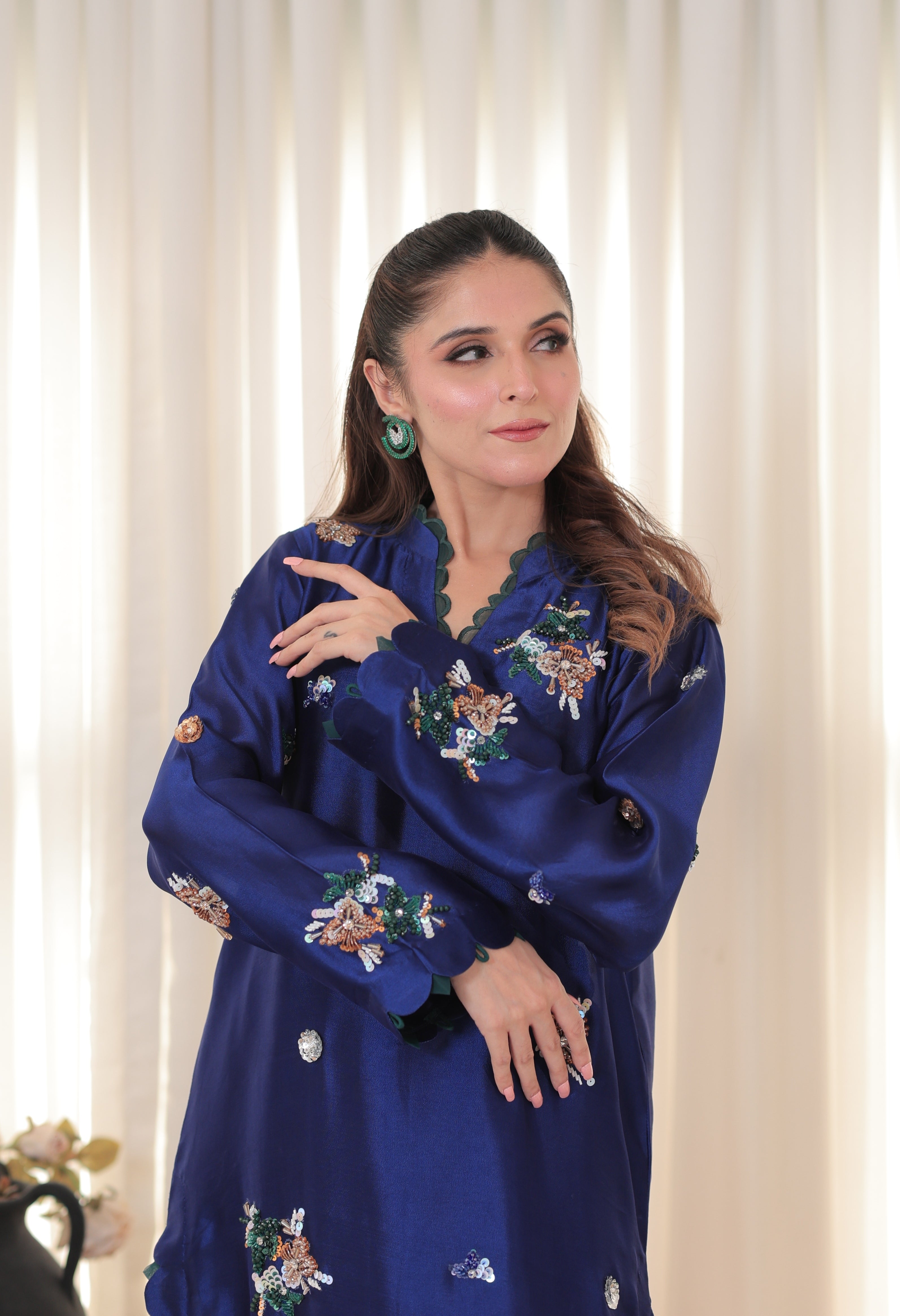 A timeless design featuring a hand-embroidered Sheesha silk shirt, organza and gota-detailed pants, and a pure organza dupatta finished with silk border and gota work. Perfect for festive and formal occasions.
