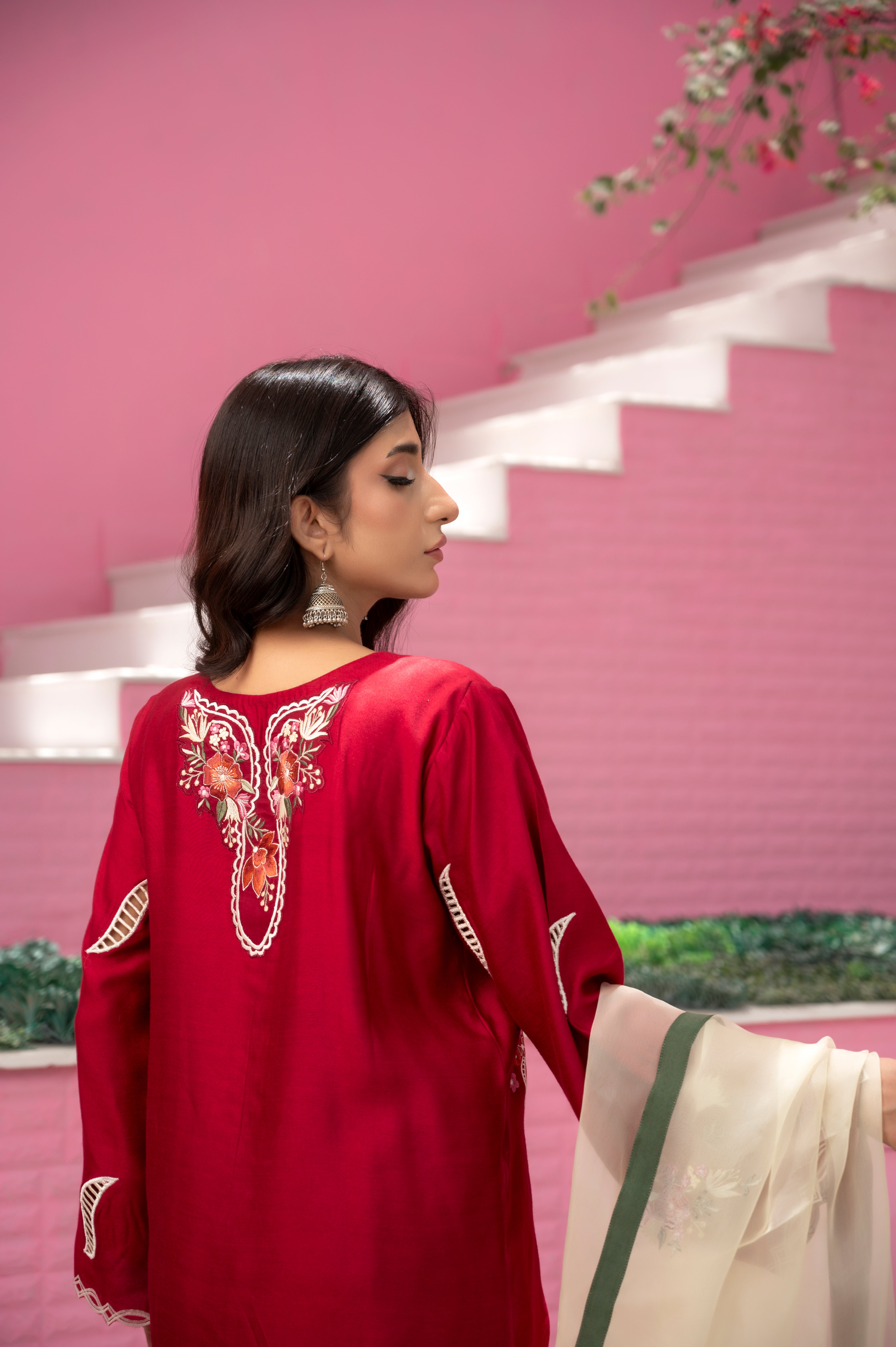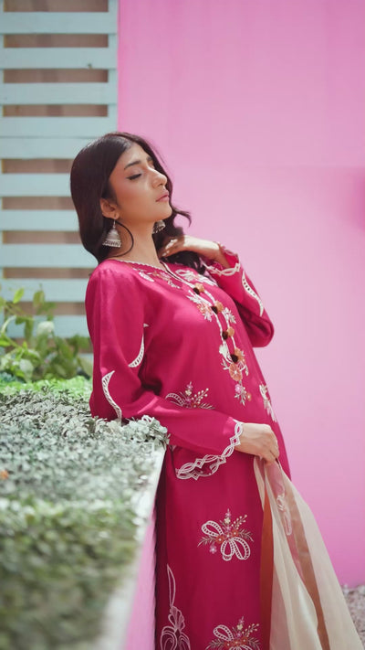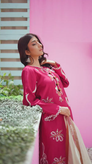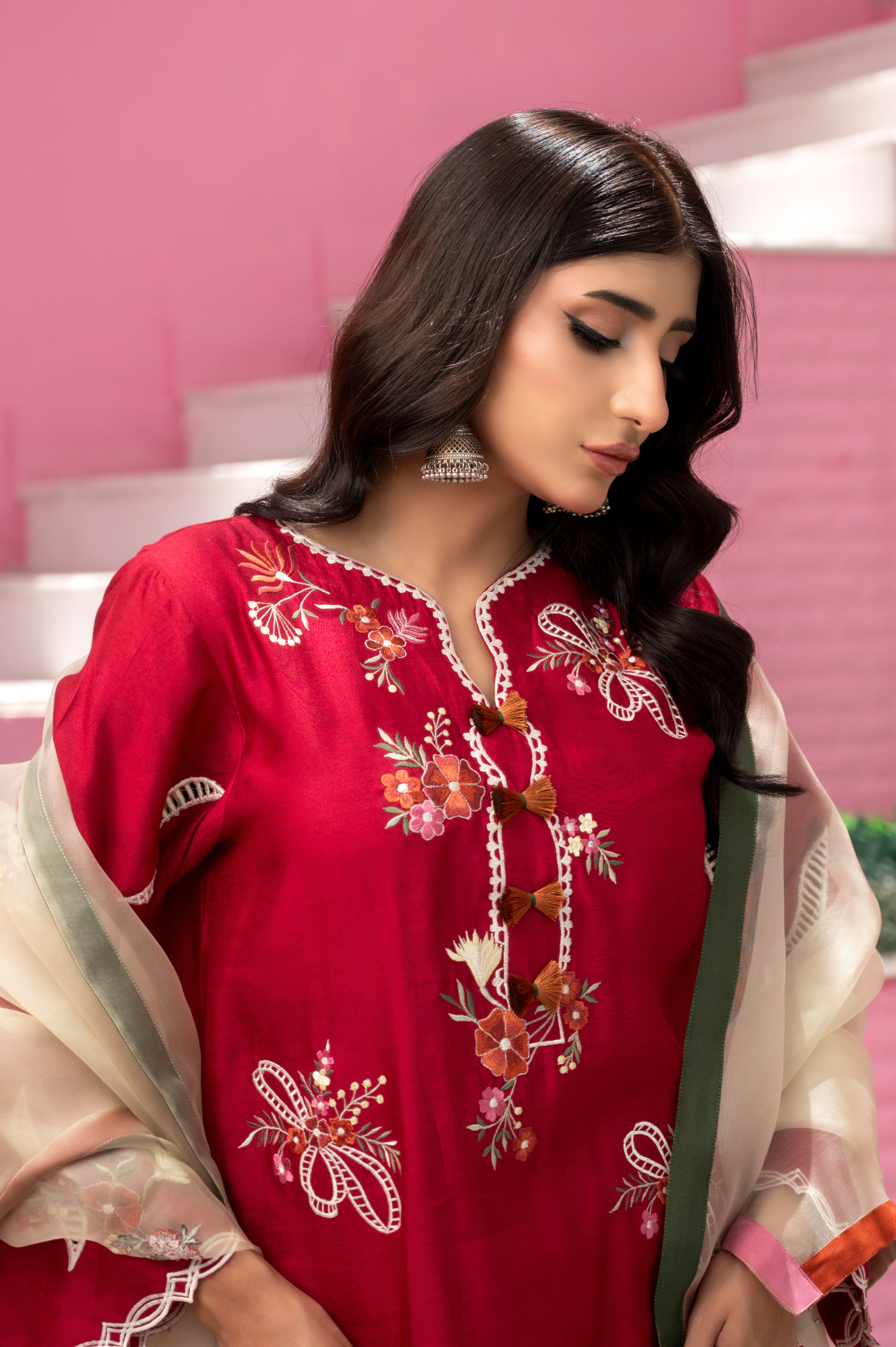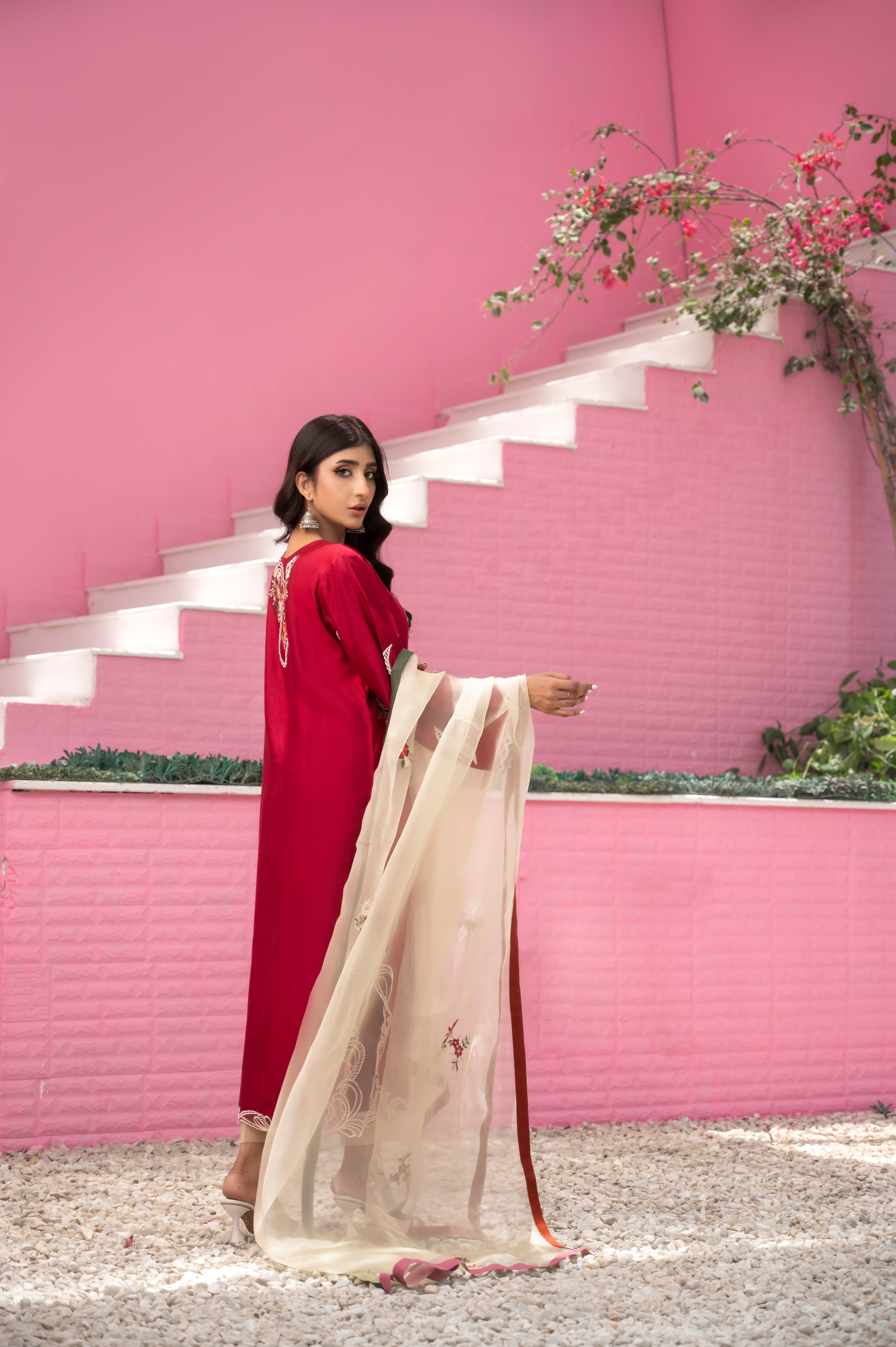 Immerse yourself in the timeless allure of Flamme β€” a masterpiece rendered in pure khaadi, tailored to perfection for the woman who embodies grace and strength. The deep crimson canvas is delicately adorned with intricate embroidery, creating a poetic balance between heritage craftsmanship and modern elegance.