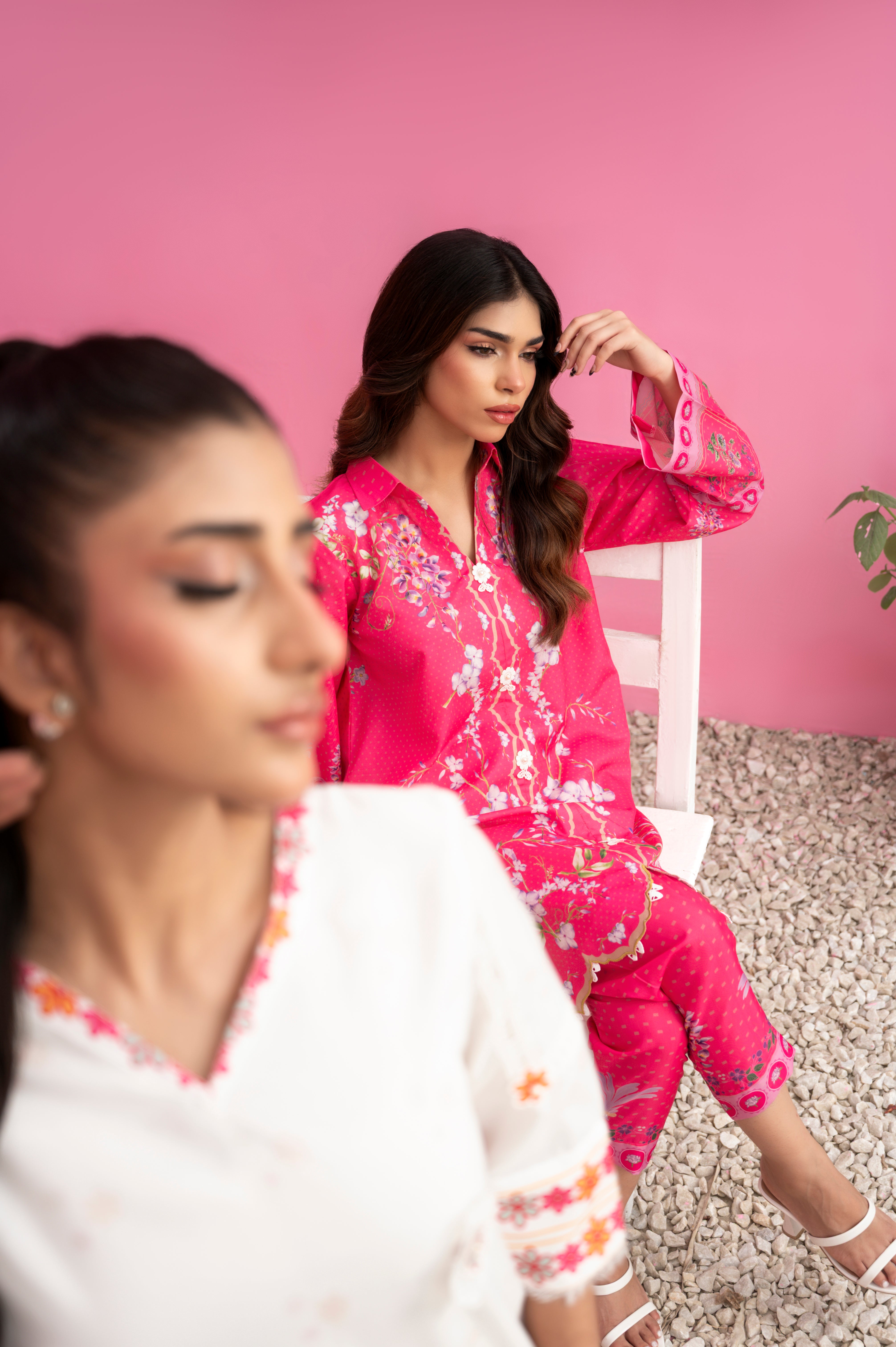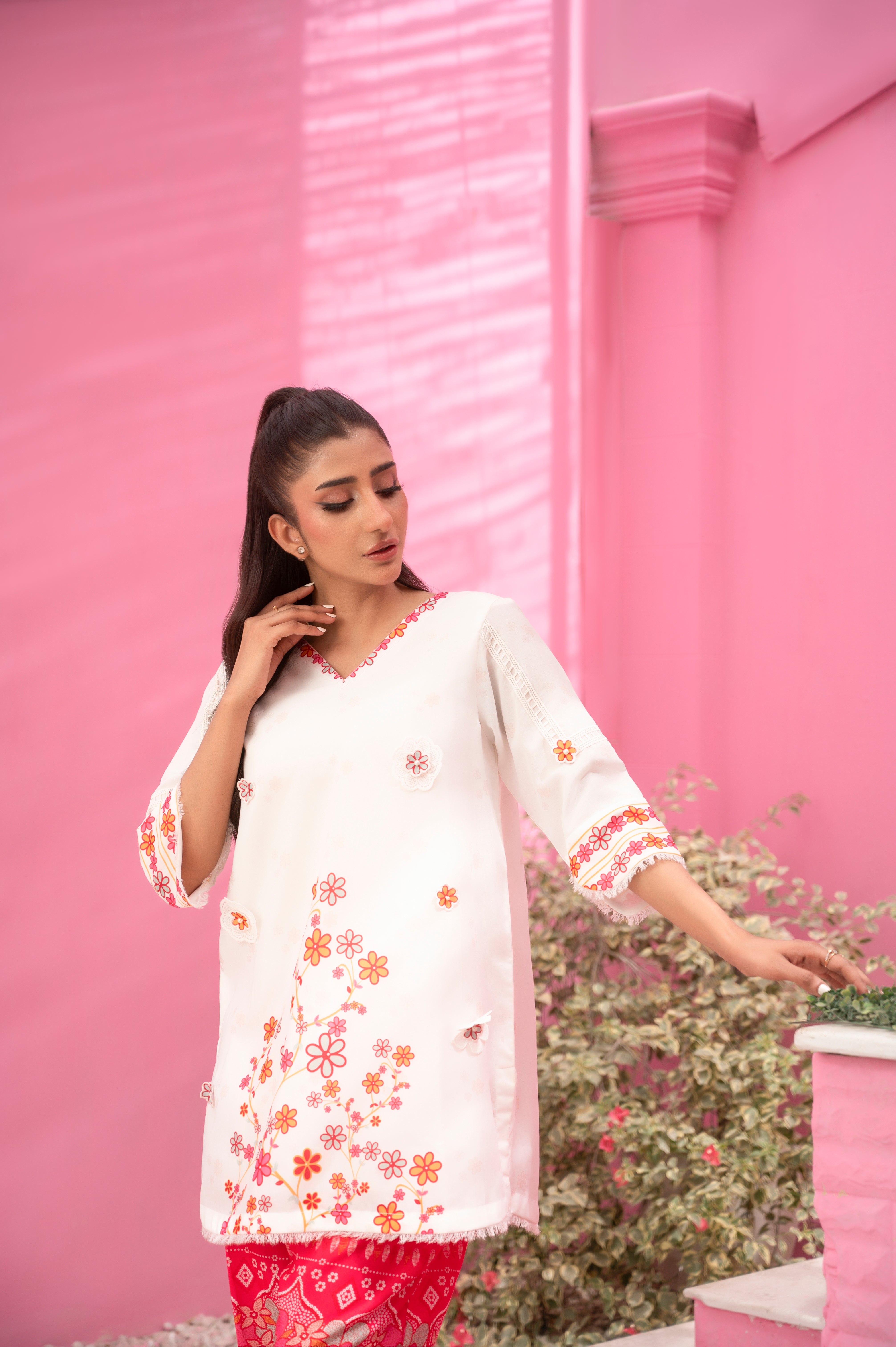 Shirt π: Straight silhouette in a fresh white base, adorned with multicolour floral digital prints πΈ, 3D lace flower appliquΓ©s πͺ‘, and airy lace insert sleeves for a breezy, feminine touch.