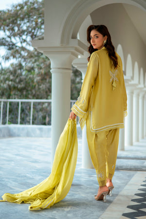 Elevate your wardrobe with Lime Luxe, a statement ensemble crafted from premium Sheesha silk. The set features a meticulously hand-embroidered shirt and trousers, complemented by a dyed silk dupatta with goti and organza detailing, finished with elegant handmade tassels. A timeless creation that blends tradition with sophistication.