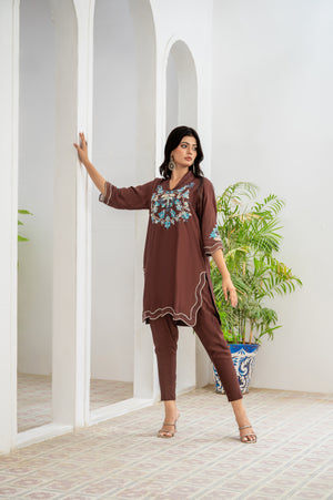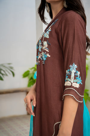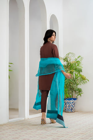 Mocha brown khaadi silk shirt with aqua blue hand embroidery and organza dupatta